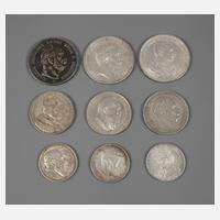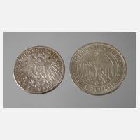 darunter zweimal 5 Reichsmark Preußen Wilhelm II. 1895 ss; 1907 ss++; sechsmal 3 Reichsmark Preußen, Wilhelm II. 1910 ss; 1911 vz; 1912 ss+; 1913 in Uniform ss+; 1913 Völkerschlachtdenkmal vz; 1913 Völkerschlacht vz; 3 Reichsmark Württemberg, Wilhelm II. 1909 ss; zweimal 2 Reichsmark Preußen Friedrich und Wilhelm II. 1901 vz; 1913 Völkerschlacht ss; sowie 2 Reichsmark Baden, Goldene Hochzeit Friedrich und Luise 1906 vz.