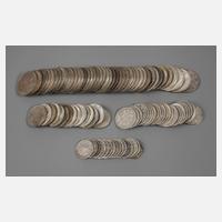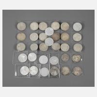 darunter fünfzehnmal 5 Reichsmark Hindenburg mit H.K; zwölfmal 5 Reichsmark Hindenburg mit Weimarer Adler; vierzehnmal 5 Reichsmark Garnisionskirche; zweimal 5 Reichsmark Garnisionskirche mit Datum; dreizehnmal 2 Reichsmark Hindenburg; zweimal 2 Reichsmark Garnisionskirche mit Datum, fünfundzwanzigmal 1 Mark 1874–1915; sowie siebzehnmal 1/2 Mark 1905–1918, gemischter Zustand von s–vz, G ca. 898 g.