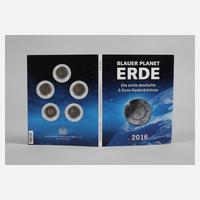 alle fünf Prägestätten der 5 Euro-Münze "Blauer Planet" mit Polymerring, prägefrisch in Kapsel im Sammelblister.