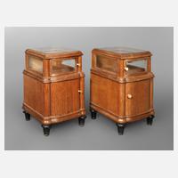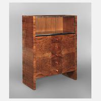 wohl Frankreich, 1930er Jahre, rückseitig Brandstempel des Herstellers sowie Modellnummer, im kaukasischen Nussbaum furnierter Korpus mit zwei Türen und fünf Schubkästen, versilberte Beschläge, Griffe aus Bakelit, Vitrinenaufsatz mit Schiebetür, zwei originale Schlüssel, Versilberung der Beschläge etwas verputzt, sonst guter Zustand, Maße 133 x 109 x 40 cm.