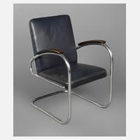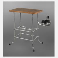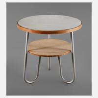 1930er Jahre, Gestell aus verchromtem Stahlrohr mit geschweißten Verstrebungen, die beiden Platten in Eiche furniert, der Rand mit rötlichem Kunststoff eingefasst, Alters- und Gebrauchsspuren, guter Zustand, Chrom Z 1-2, Maße 76 x 87 x 60 cm.