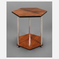 wohl Frankreich, 1930er Jahre, sechseckige Platten, in Nussbaum furniert, getragen von Säulen aus verchromtem Stahlrohr, auf kugelförmigen Füßen, Alters- und Gebrauchsspuren, Maße 52 x 44 x 44 cm.