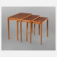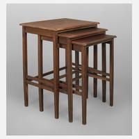 um 1920, Eiche massiv, braun gebeizt, der äußere Tisch mit 14 gedrechselten und ebonisierten Kugeln verziert, ineinander schiebbare, verschieden große Tische mit facettgeschliffener Glasplatte, guter Originalzustand, Maße max. 78 x 62 x 42 cm.