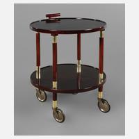 Unterseite mit Brandstempel J & J Kohn, wohl 1920er Jahre, runder Servierwagen, auf vier Rädern gelagert, Platten aus rötlich gebeiztem Schichtholz, Säulen mit Messingmanschetten, wohnfertig restauriert, H 68 cm, D 55 cm.