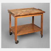 deutsch, 1930er Jahre, Nussbaum furniert, Platte mit fein intarsiertem Rosendekor, in verschiedenen Edelhölzern, teils brandschattiert, normale Altersspuren, Maße 62 x 80 x 47 cm.