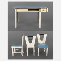 um 1930, bestehend aus Esstisch und drei Stühlen, aus massivem Nadelholz und Schichtholz, weiß gefasst, die Oberfläche mit blauem Kunststoffbelag, die Stuhllehnen und Tischbeine mit verchromten Zierstreben, Farbfassung übergangen, teilweise abgeblättert, rest.bed., Maße Tisch 78,5 x 125 x 69 cm, Stuhl H 85 cm, SH 44 cm.