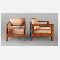 deutsch, um 1925, strenger geradliniger Korpus in Nussbaum furniert, die lose aufgelegten Polster mit originalem Stoffbezug, die Sitzfläche leicht schräg geneigt, Furnier mit mehreren kleinen Fehlstellen, restaurierungsbedürftig, Maße 60 x 60 x 70 cm.