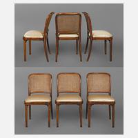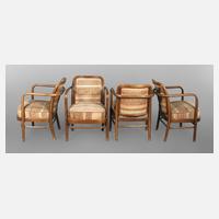 Entwurf Josef Hoffmann & Josef Frank 1920er Jahre, Model A811, Zarge mit Brandstempel "Thonet 52", Buchenbugholz braun gebeizt, Lehne mit originalem Geflecht, erneuertes Polster mit Stoffbezug, Oberfläche mit späterer Beize, restaurierungsbedürftig, H je 82 cm, SH je 48 cm.