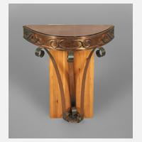 wohl Frankreich, 1930er Jahre, Kupferblech partiell brüniert, halbrunde Konsole mit verspiegelter Glasplatte, Halterung für Wandmontage, das abgebildete Holzbrett nur für Transport befestigt, Maße 92 x 74 x 30 cm.