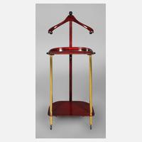 Entwurf Josef Frank, 1930er Jahre, Variante des A413F mit Polster, Buchenbugholz braun gebeizt, Zarge mit originalem Klebeetikett, Sitz mit lose aufgelegtem Polster, vermutlich originaler Stoffbezug, Alters- und Gebrauchsspuren, Maße je 79 x 52 x 48 cm.