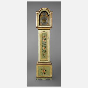 Eskilstuna, Schweden, um 1800, auf Ziffernblatt signiert und nummeriert "No. 424", Werk mit zwei Gewichten, Halbstundenschlag auf Glocke, Ziffernblatt mit bogenförmigem Abschluss und aufgelegtem Messingzierrat, dieser später goldbronziert und mit einer Fehlstelle, zweiteiliges Gehäuse aus Nadelholz mit Rosendekor verziert, Farbfassung erneuert, rest.bed., Maße 205 x 50 x 25 cm.