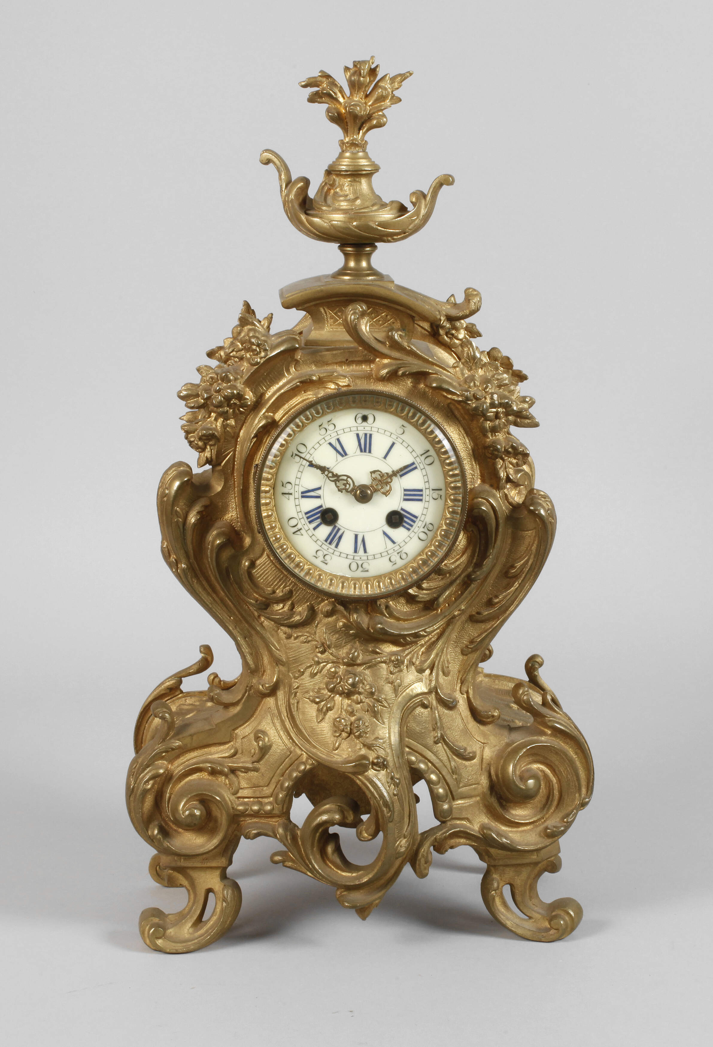 Frankreich, um 1890, auf der Werkplatine gemarkt F. Marti et Cie, Gehäuse im Louis XV.-Stil aus Messingguss, makelloses emailliertes Ziffernblatt mit blauen römischen Zahlen und schwarzer Minuterie, Werk läuft, Pendel und Glocke fehlen, H 52 cm.