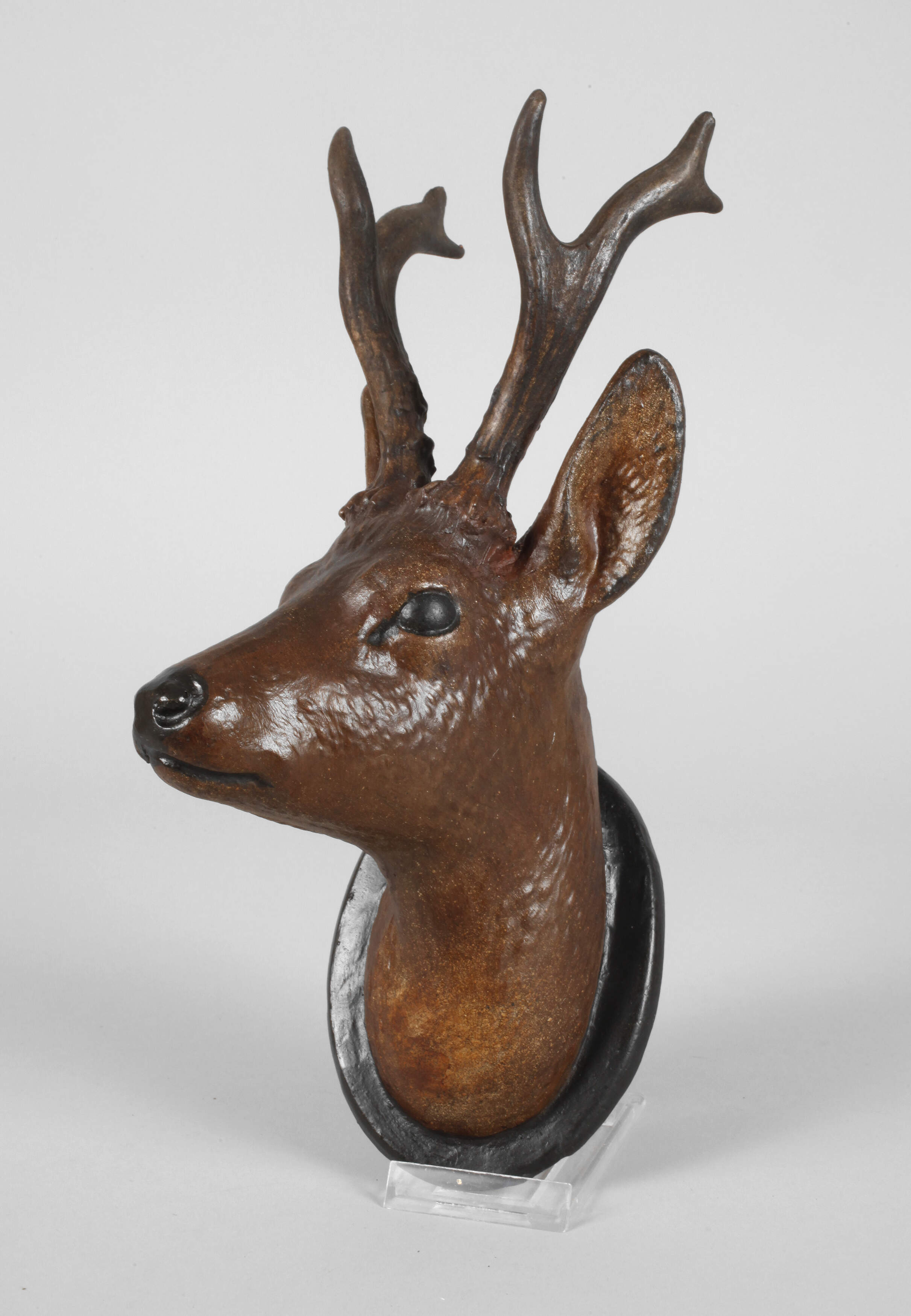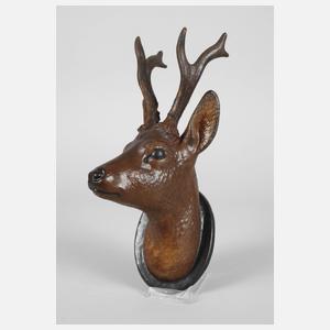 Ende 19. Jh., Holz geschnitzt, farbig gefasst, plastisch gearbeitetes Rehbockhaupt mit aufgesetztem Gehörn, kleinere Substanzverluste, H 35 cm.