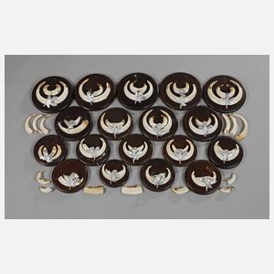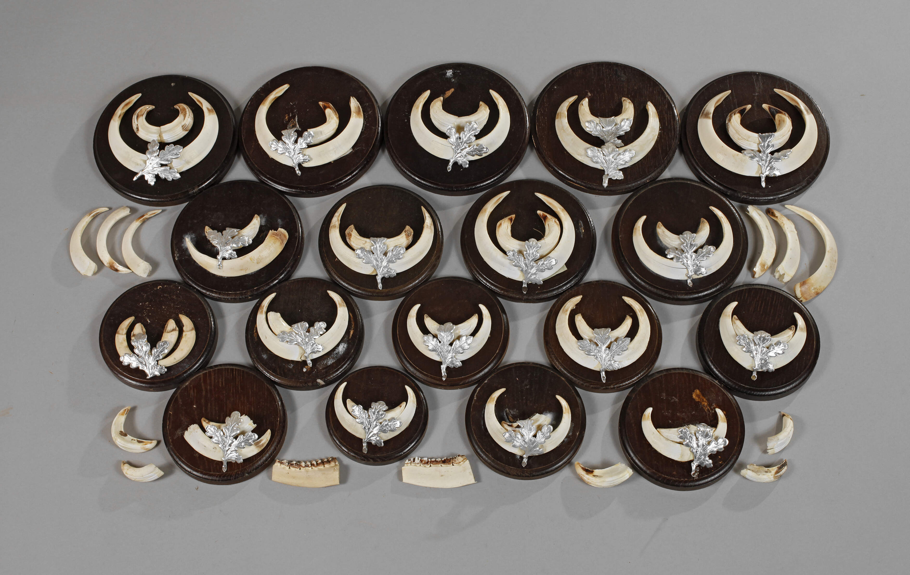 Anfang 20. Jh., 18 dunkel gefasste Laubholzbretter mit montiertem Gewaff, einige Hauer lose beigegeben, Altersspuren, Substanzverluste, D ca. 15 cm.