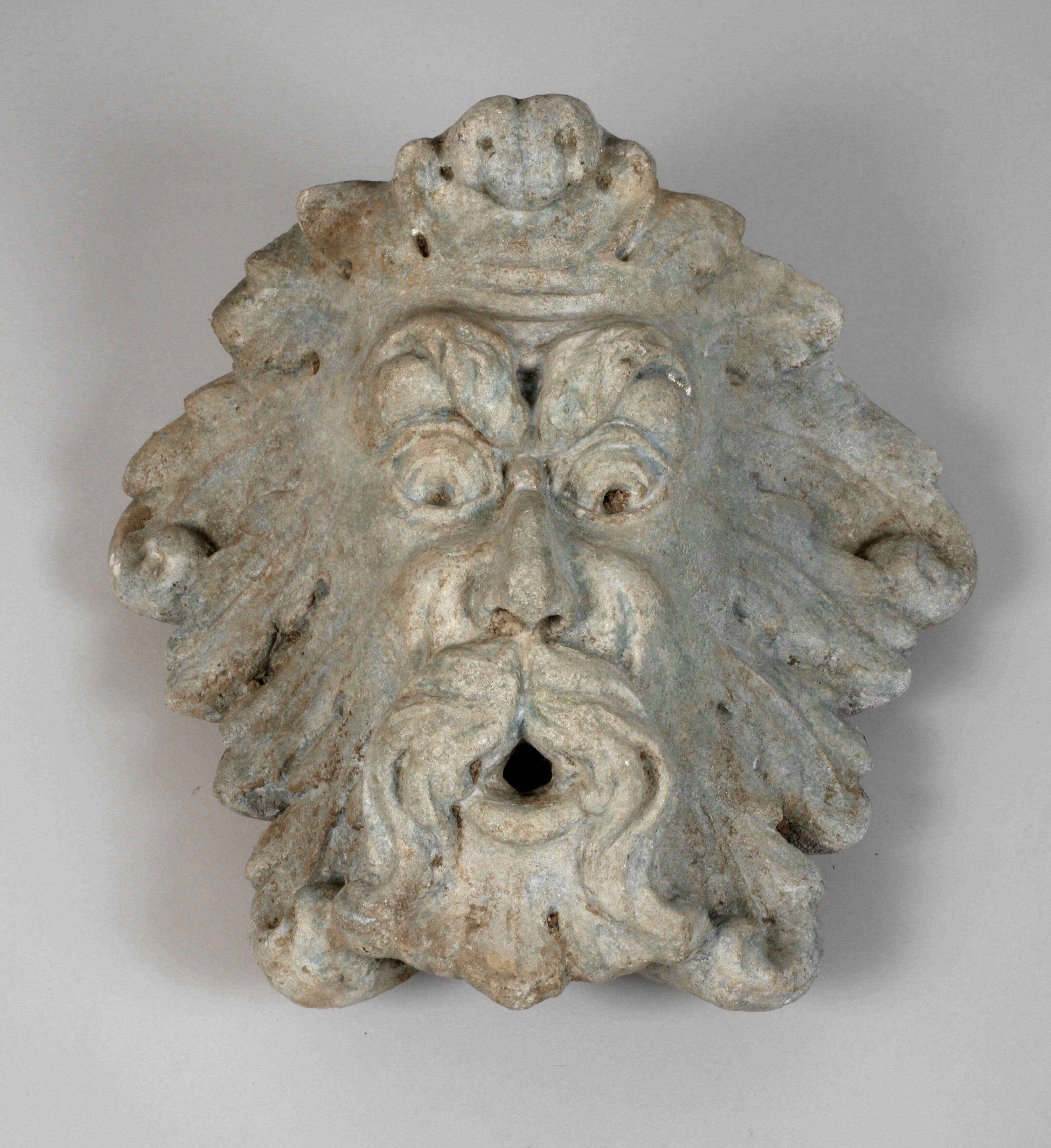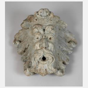 Steinguss, 20. Jh., Kopf eines Wassergottes, Mund mit Öffnung, rückseitig Wandaufhängung, Maße 34 x 37 x 22 cm.