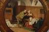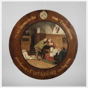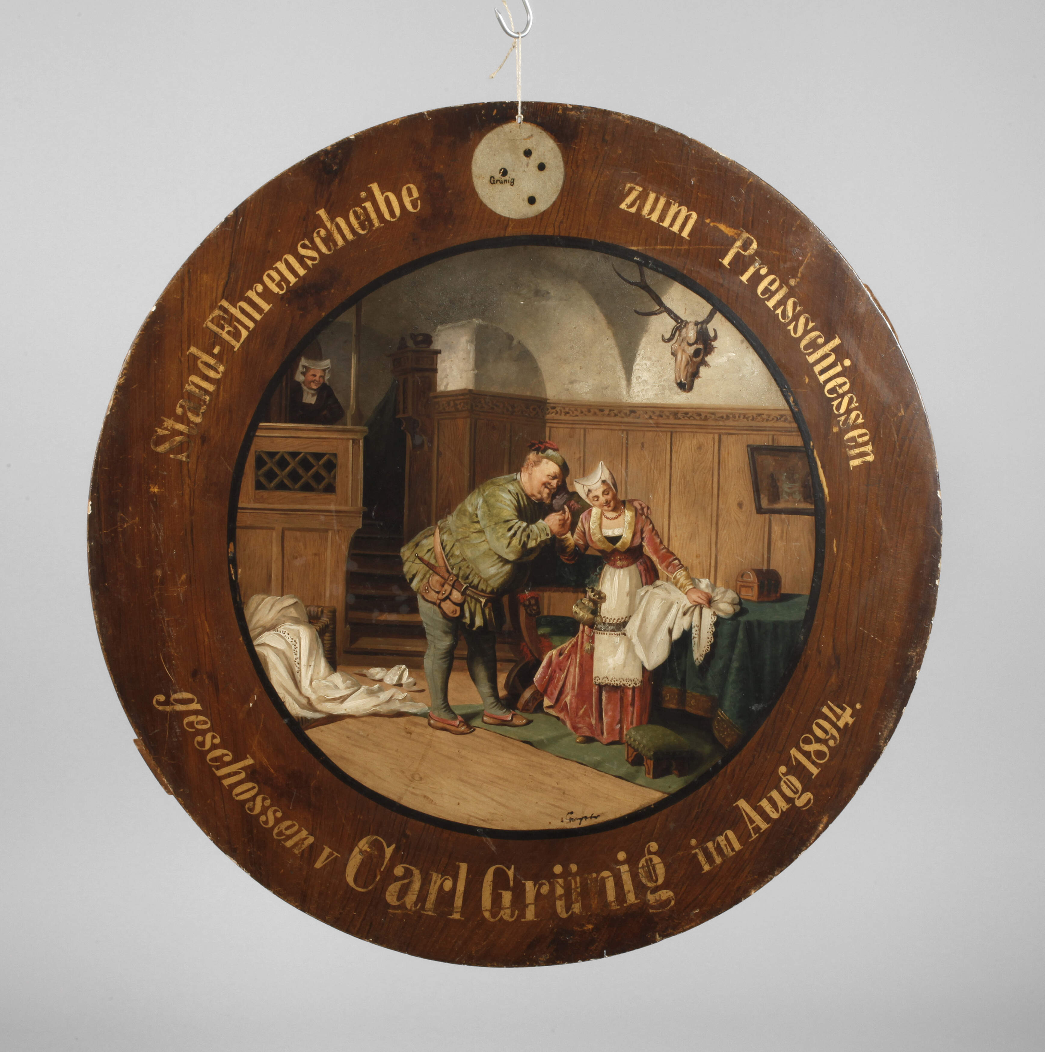 datiert 1894, Laubholz zweifach gesperrt, mehrfarbig gefasst, signiert, mit Umschrift "Stand-Ehrenscheibe zum Preisschiessen geschossen v. Carl Grünig im Aug 1894", zentrale Genreszene in historisierender Manier, Altersspuren, D 60 cm.