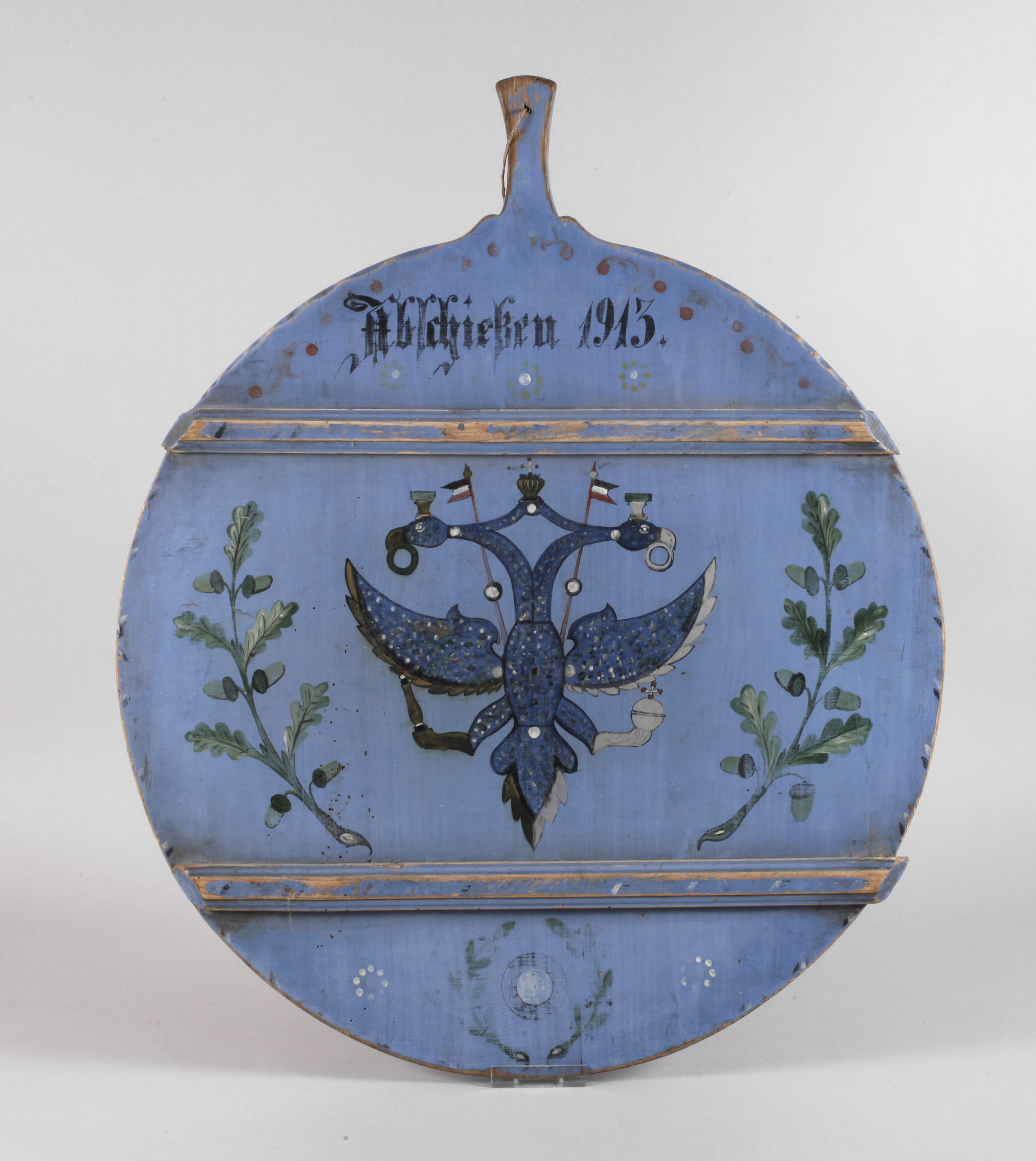 Nadelholz beschnitzt, mehrfarbig gefasst, Umschrift Abschießen 1913, aus einem Kuchenbrett gefertigte Scheiben, blau gefasst, zentrales Doppeladlermotiv, gerahmt von Eichenlaub, berieben, Altersspuren, wurmstichig, H 80 cm.