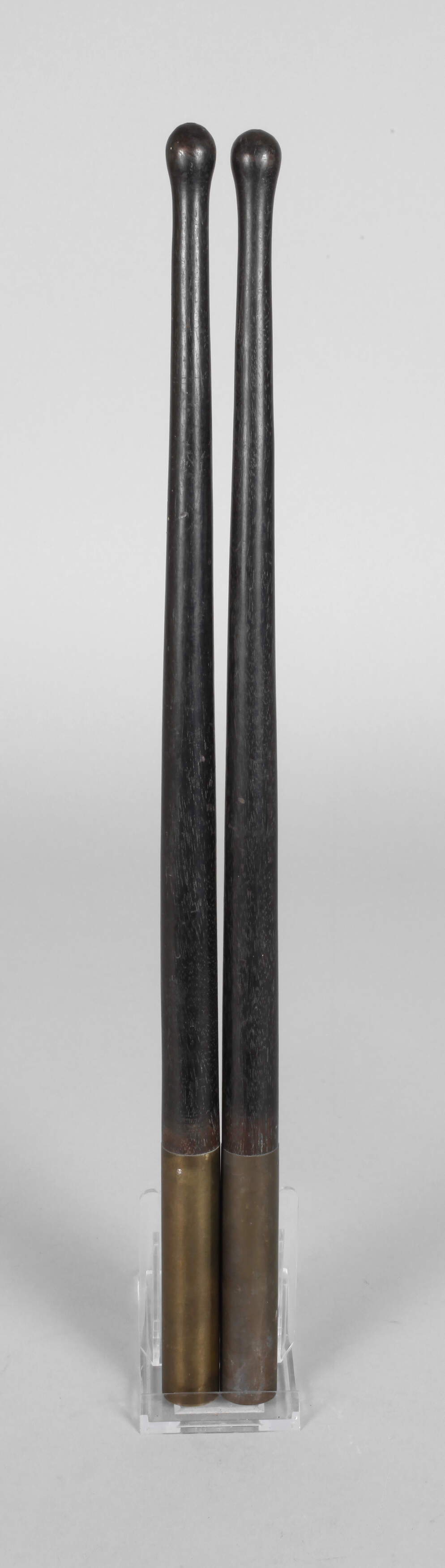 Marienberg, datiert 1918 und signiert Clemens Kreher, massive Schlägel aus Ebenholz mit Messinggriffstücken, vermutlich zum Spielen einer militärischen Marschtrommel, gute Erhaltung mit leichten Altersspuren, L je 46 cm.