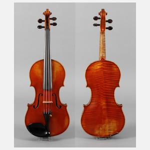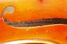 auf Klebezettel bezeichnet A. Udo Wunderlich Landwüst b/Markneukirchen Made in Germany Copie of Antonius Stradivarius 1931 und Brandmarke Enrico Rocca, Modell nach E. Rocca - Stradivari, geteilter, sehr gleichmäßig geflammter Boden in feurig hellem, rotem Lack, dreiteilige umlaufende Randeinlage, rissfreie Decke, Alters- und Gebrauchsspuren, im Etui, L Korpus 35,8 cm.