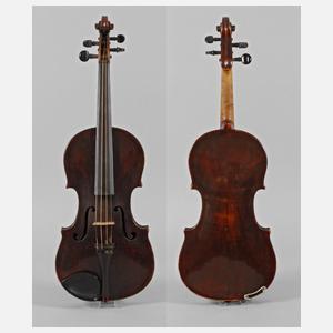 Anfang 20. Jh., ohne Zettel, geteilter, kaum geflammter Boden in walnussbraunem Lack, umlaufende Randeinlage, Decke mit verfestigter Rissbildung, Alters- und Gebrauchsspuren, mit defektem Bogen, im Etui, L Korpus 35,8 cm.
