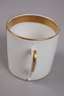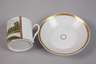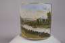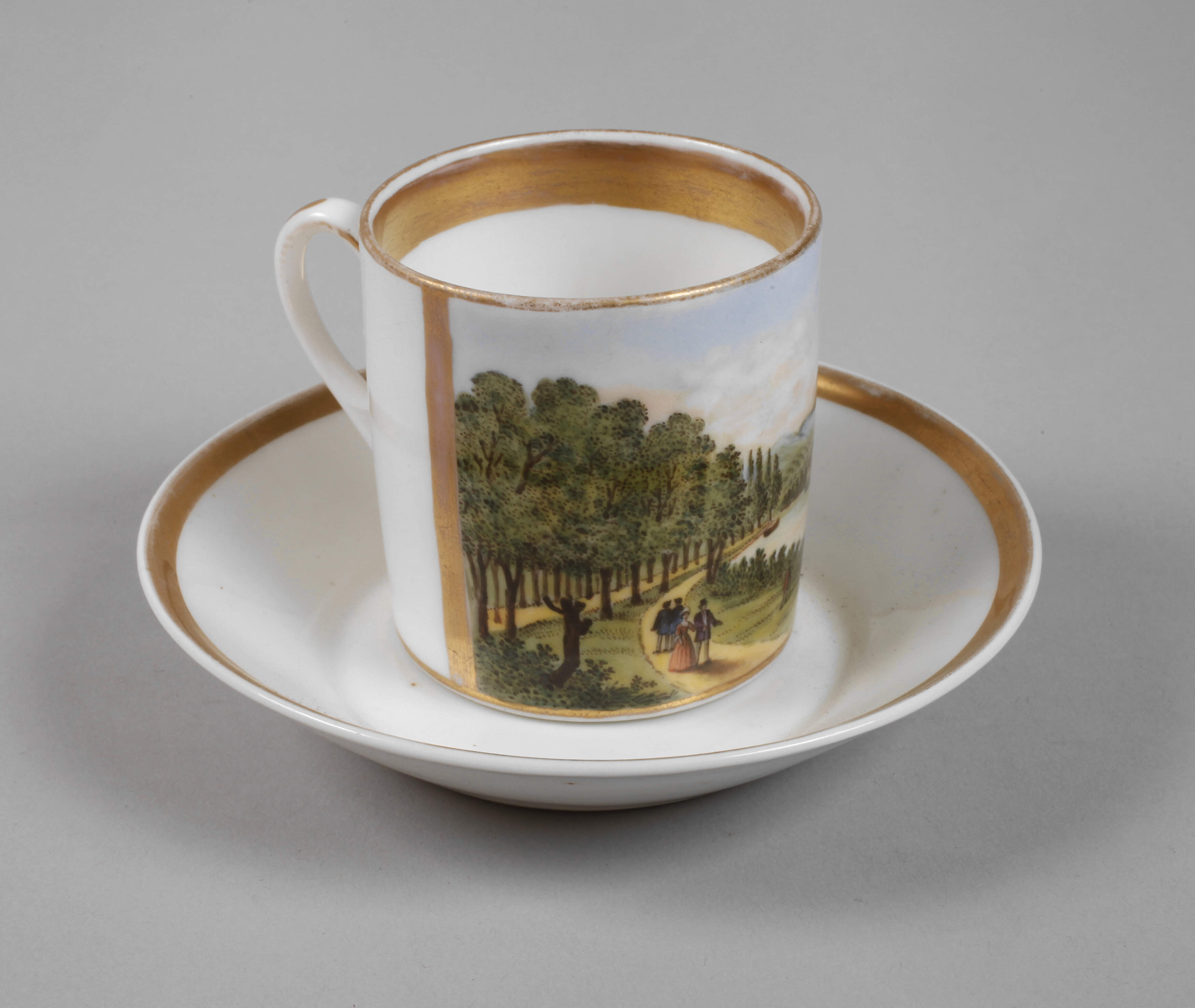 um 1840, ungemarkt, am Boden undeutliche Pinselbezeichnung in Schwarz, Zylinderform mit Goldrändern, schauseitig große Rechteckkartusche mit Vedute in polychromer Aufglasurbemalung, Panoramablick auf eine Gebirgslandschaft mit Uferterrasse, Anglern und Flaneuren, dazu wohl originale Untertasse mit Ritznummer 4, Goldränder etwas berieben, sonst guter altersgemäßer Zustand, H 6,5 cm.