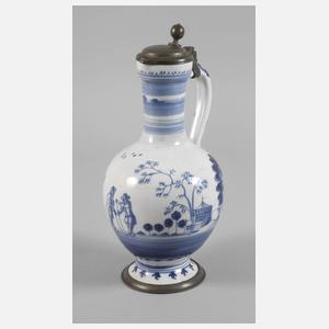 um 1750, ungemarkt, rötlicher Fayencescherben handabgedreht, weiß glasiert und mit kobaltblauer Scharffeuerfarbe bemalt, schauseitig zwei Wandersleute mit Stecken, seitlich Architekturmalerei und Baummotive, Henkel bemalt mit Voluten, Zinnmontierung bestehend aus Standring und übergreifendem Deckel, dieser innen alt gelötet, geringe Glasurfehlstellen am Mündungsrand, sonst normale Gebrauchs- und Altersspuren, H ca. 31 cm.