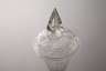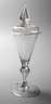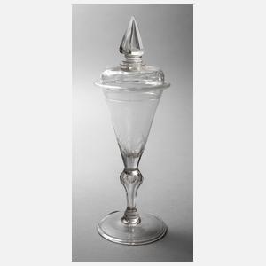 um 1760, farbloses Glas, breiter flacher Scheibenfuß mit nach unten umgeschlagenem Stand, facettierter Balusterschaft mit Luftblase, kelchförmige Kuppa im Ansatz mit Kerbschliffdekor, originaler dazugehöriger Deckel mit hohl geblasenem Knauf, dieser fünffach in Schälschliff facettiert, Spitze winzigst bestoßen, sonst sehr guter Zustand, H 26 cm.
