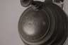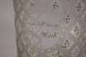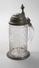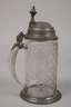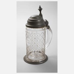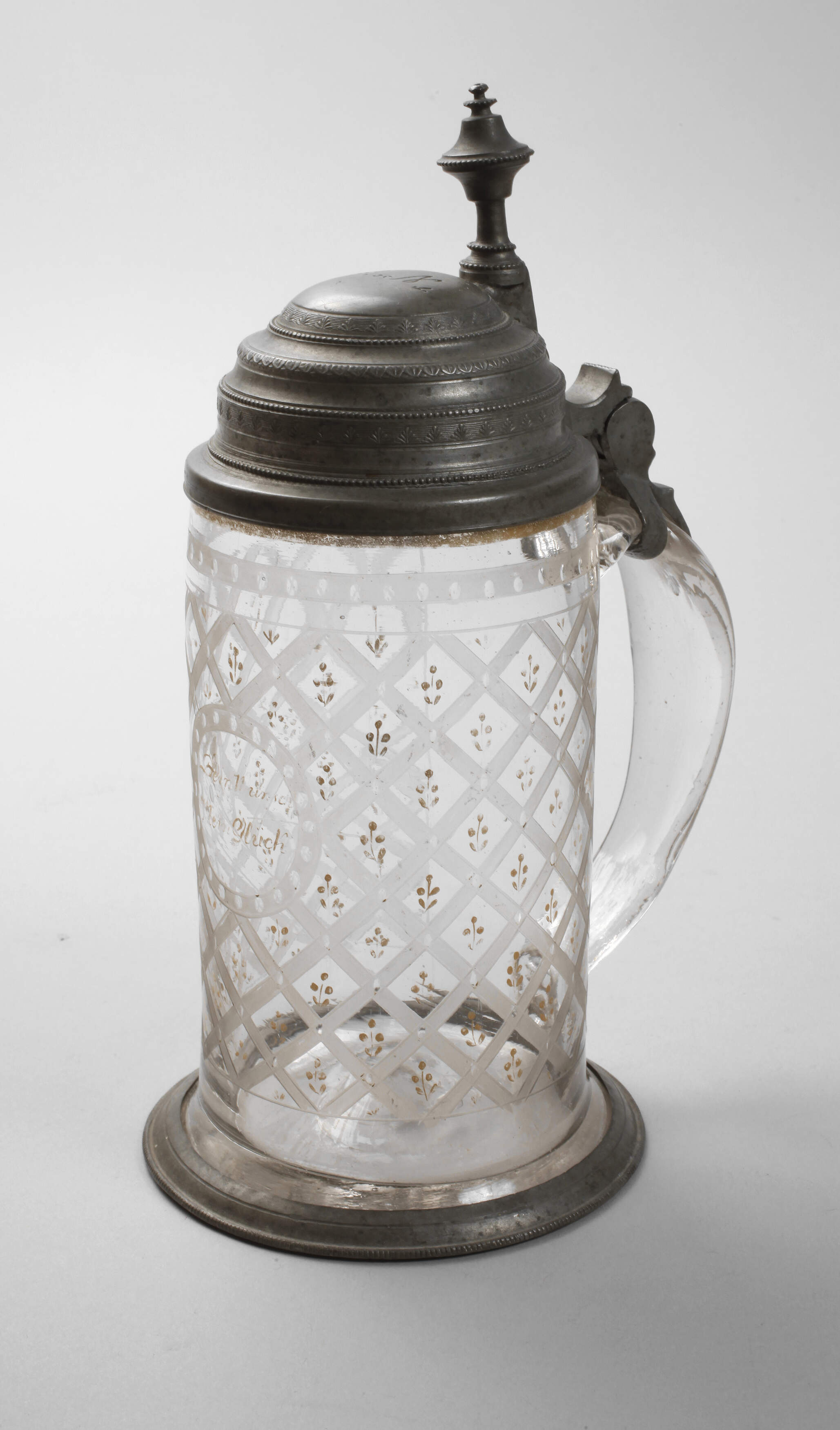 19. Jh., farbloses Glas, blasiger Abriss, Quadratenschliff mit goldenen Blümchen und Aufschrift in einer runden Kartusche, breiter Bandhenkel, Zinnmontierung, normale Altersspuren, H ca. 22 cm.