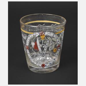 18. Jh., farbloses Glas, blasiger Abriss, konische Form mit opaker Emaillebemalung, schauseitig Wappen mit Schneiderutensilien, umlaufend Spruch: "Daß erbare Handwerck der Schneider thu ich bescheidt", geringe Fehlstellen im Emaille, sonst unbeschädigter Zustand mit normalen Altersspuren, H ca. 10 cm.