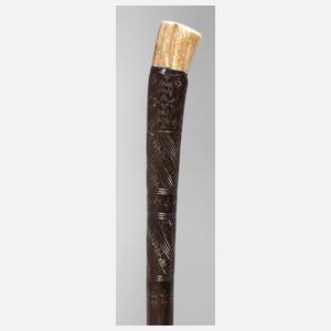 um 1900, das Griffstück aus einem Eberzahn gefertigt, der Schuss aus dunklem Tropenholz, ornamental beschnitzt und von zarten Einlegearbeiten aus Golddraht verziert, Metallzwinge, Alters- und Gebrauchsspuren, H 92 cm.