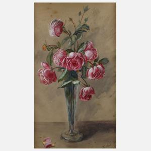 rote Rosen in hoher Glasvase vor lichtem Grund, Mischtechnik (Aquarell und Gouache) auf Papier, um 1900, rechts unten signiert "K. Sachtler", eventuell handelt es sich um die als "Käthe Sachtler" geborene Ehefrau des Berliner Architekten Paul Eduard Hoppe, rückseitig altes Rahmungsetikett Berlin, fleckig, partiell oxidiert, hinter Glas im schönen Goldstuckrahmen (bestoßen) gerahmt, Falzmaße ca. 60 x 36,5 cm.