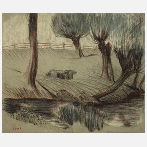 Blick über einen von Bäumen gesäumten Teich auf eine Weide mit liegender Kuh, Pastellkreiden auf grünem Papier, um 1910, links unten in Rot mit Stempel monogrammiert "P.Sch.R.", rückseitig fragmentarischer Stempelabdruck im Oval, leichte Knickspuren, Blattmaße ca. 32,5 x 38,5 cm. Künstlerinfo: eigentlich Georg Paulus [Paul] Schad, kurz vor 1900 nahm er den Künstlernamen "Schad-Rossa" an, dt. Maler, Zeichner, Kopist und Bildhauer (1862 Nürnberg bis 1916 Berlin-Steglitz), 1877-80 Lehre zum Bildhauer und Schüler der Kunstgewerbeschule Nürnberg bei Gustav Adolf Gnauth, ab 1880 Hinwendung zur Malerei, 1880-88 Studium an der Akademie München bei Ludwig von Löfftz, ab 1883 Meisterschüler von Franz von Defregger, parallel 1883-88 tätig als Kopist für König Karol von Rumänien, anschließend vor allem als Freilichtmaler tätig, 1889-94 Mitglied im Münchner Künstlerverein, 1895-1900 Betreiber einer Malschule in München, 1900 Übersiedlung nach Graz, Gründung einer Kunstschule sowie Gründung des bis 1903 bestehenden Grazer Künstlerbundes, 1901 einmalige Herausgabe der Zeitschrift "Grazer Kunst", 1904 Übersiedlung nach Berlin, unternahm Studienreisen nach Italien (1909), Spanien und Portugal (1910/11) sowie in die bayerischen Gebirge (ca. 1912), beschickte unter anderem den Münchner Glaspalast und die Große Berliner Kunstausstellung, Quelle: Thieme-Becker, Saur "Bio-Bibliographisches Künstlerlexikon", Müller-Singer, Dressler, Bruckmann "Münchner Maler des 19./20. Jh.", Wikipedia, Matrikel der Münchner Akademie, Glaspalastkataloge und Velten Wagner "Paul Schad-Rossa - Die Wiederentdeckung eines Symbolisten".