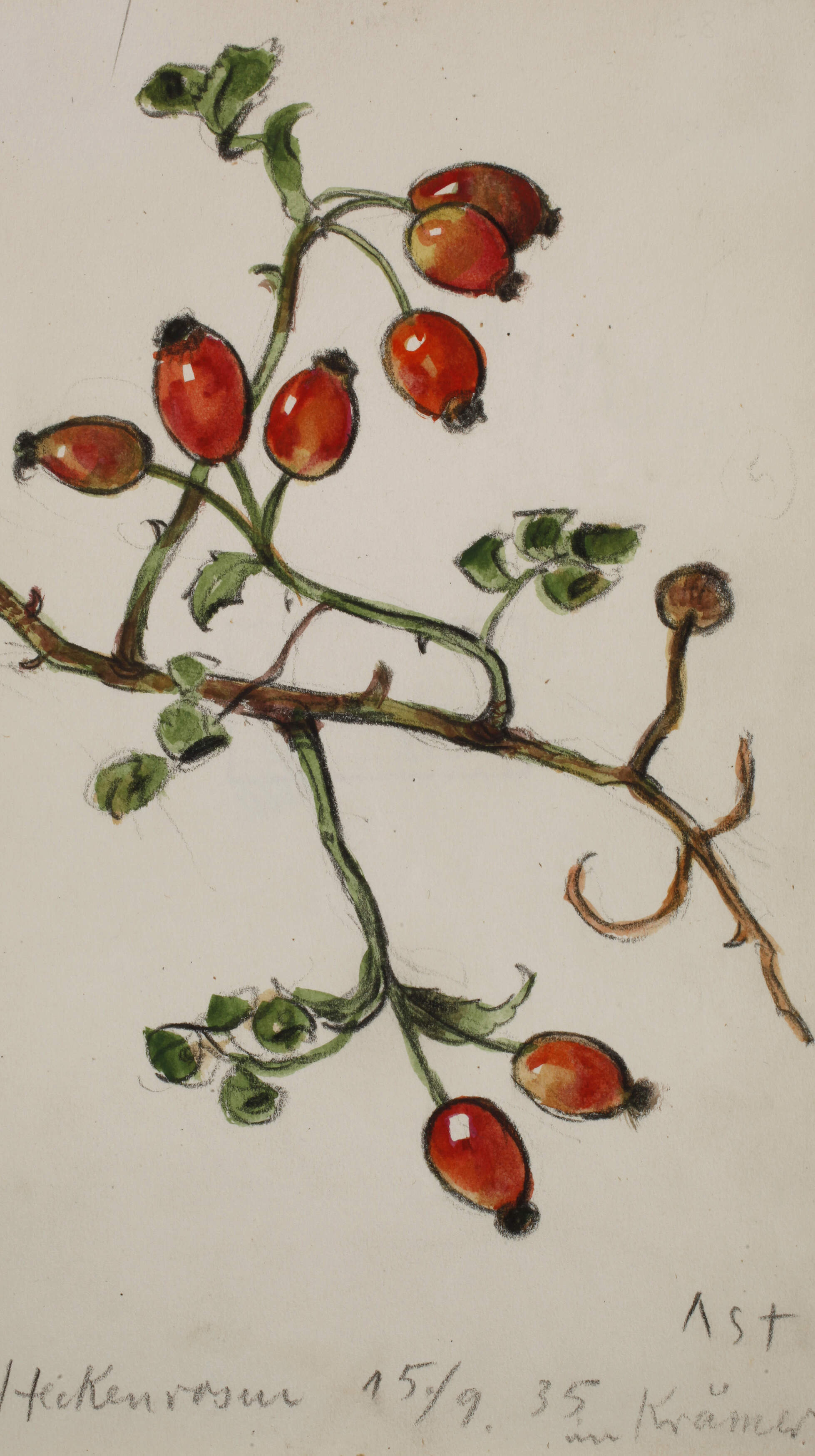 Zweig mit rot leuchtenden Hagebutten und einigen Blättern, Aquarell über Bleistift, rechts unten handsigniert "Ast", im unteren Bereich betitelt, datiert und bezeichnet "Heckenrosen 15./9. (19)35 im Krämer", auf Unterlagekarton montiert und in rahmenlosen Bilderträger eingelegt, Blattmaße ca. 21,5 x 12,5 cm. Künstlerinfo: auch Albert-Schäfer-Ast, dt. Zeichner und Karikaturist (1890 Barmen bis 1951 Weimar), Lehre als Bildhauer, 1906–11 Studium an der Kunstgewerbeschule Düsseldorf, tätig für diverse Zeitschriften, Teilnahme am 1. Weltkrieg, von den Nationalsozialisten als entartet eingestuft und teilweise Arbeits- und Ausstellungsverbot, unter Auflagen ab Mitte der 1930er Jahre wieder tätig, 1943 bei einem Bombenangriff auf Berlin Verlust seiner Wohnung, Umzug nach Prerow auf dem Darß, ab 1946 wieder als Karikaturist für den Ulenspiegel tätig, Ernennung zum Professor an der Staatlichen Hochschule für Baukunst und bildende Künste in Weimar, Quelle: Vollmer, Eisold „Künstler in der DDR“ und Wikipedia.