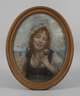 lächelndes Mädchen in holländischer Tracht mit roten Zöpfen unter weißer Haube, andächtig einen Schmetterling [Kleiner Fuchs] auf ihrer Hand betrachtend, flott erfasste, hochovale Portraitmalerei, Mischtechnik (Pastellkreide über Bleistift) auf Papier, um 1930, rechts signiert "M. Philips-Weber", etwas fleckig und reinigungsbedürftig, original hinter Glas im Ovalrahmen gerahmt, Falzmaße ca. 61,5 x 49 cm. Künstlerinfo: geborene Marie oder Maria Weber, nannte sich als Ehefrau des Malers Hermann August Philips "Philips-Weber", dt. Portrait- und Genremalerin sowie Zeichnerin (erwähnt 1873 bis 1930), Schülerin der Damenmalschule von Wilhelm von Lindenschmit dem Jüngeren und Heinrich Stelzner in München, beschickte ab 1873 den Münchner Glaspalast und vertreten auf den Großen Berliner Kunstausstellungen, Sommeraufenthalte in Ammerland am Starnberger See, verlebte ab ca. 1890 mit ihrem Mann 30 Winter in Rom, tätig für die Pariser Zeitschrift "L'Art", für die sie Zeichnungen kunstgewerblicher Objekte aus dem Bayerischen Nationalmuseum München, dem Germanischen Nationalmuseum Nürnberg und den Vatikanischen Museen lieferte, Mitglied der Münchner Künstlergenossenschaft und im Reichsverband bildender Künstler Deutschlands, tätig in München, Quelle: Thieme-Becker, Saur "Bio-Bibliographisches Künstlerlexikon", Glaspalastkataloge, Boetticher, Bénézit, Bruckmann "Münchner Maler des 19./20. Jh.", Seubert und Dressler.