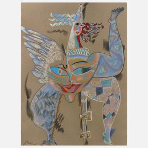 fantasievolle Darstellung einer Frau mit seitlichen Beinen und Flügeln, Kreidezeichnung und Goldfarbe auf grauem Papier, links unten signiert und datiert "Maiofis (19)94", unter Passepartout und ohne Glas gerahmt, Passepartoutausschnitt ca. 62 x 47 cm. Künstlerinfo: auch Michel Maiofiss, russ. Maler, Zeichner und Illustrator (geboren 1939 in St. Petersburg), 1989 in die USA ausgewandert, lebt und arbeitet in Los Angeles, Vater des Künstlers Gregori Maiofis, Quelle: Internet.