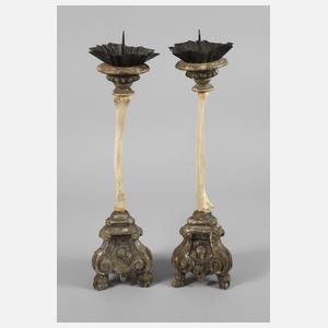 18. Jh., Holz geschnitzt, gestuckt und silberbronziert, passig geschweifte Basen auf Löwentatzen, die Leuchterarme aus Bein gestaltet, aufgesetzte Tropfschalen aus Eisenblech, Substanzverluste, Altersspuren, H je 50 cm.