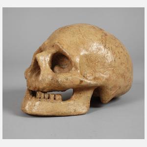 19. Jh., Holz geschnitzt und farbig gefasst, plastische Darstellung eines menschlichen Schädels, kleinere Farb- und Substanzverluste, L 23 cm.