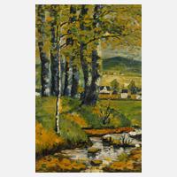 sommerliche Landschaft mit kleinem Bach, der sich an einem Birkenwäldchen entlangschlängelt, mit Dorfkulisse und Berg im Hintergrund, etwas pastose, überwiegend glänzende Malerei in harmonischer Farbigkeit, Öl auf Faserplatte, unten rechts signiert und datiert "J. Weiß [19]31", rückseitig bezeichnet "Blick vom Fichtelberg!", gerahmt, Falzmaße ca. 42 x 28 cm, Künstlerinfo: eigentl. Hans Weiß, dt. Maler und Grafiker (1914 Aue bis 1984 Aue), zur Unterscheidung anderer gleichnamiger Künstler nannte er sich auch Hans Weiß-Aue, von 1929–1933 Ausbildung zum Musterzeichner an der Staatlichen Zeichenschule für Textilindustrie in Schneeberg, dort später Dozent und Direktor, Arbeit als Musterzeichner in Falkenstein/Vogtl., später Tätigkeit in Zwickau, Leipzig und Chemnitz, ab 1945 als freischaffender Maler in Aue und Lehrer für Kunsterziehung an der Volkshochschule in Aue und an der Berufsschule in Zwickau, 1951 Umzug nach Schneeberg, 1945 einer der Organisatoren der Kunstausstellung Befreite Kunst in Aue und im November 1945 Gründungsmitglied der Ortsgruppe des Kulturbundes, Mitglied des Verbands Bildender Künstler der DDR, ab 1973 zusammen mit anderen einheimischen Künstlern wie Kurt Teubner, Ernst Hecker oder Helmut Humann Nutzung eines Ausstellungspavillons Bildende Kunst am Altmarkt, wo er seine Aquarelle und Holzschnitte auch zum Verkauf anbot, seine Werke sind im Schloss Schlettau in der Sammlung Erzgebirgische Landschaftskunst zu sehen, Quelle: Wikipedia.
