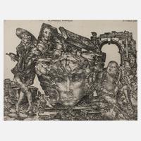 historische Relikte wie ein Torbogen sowie zwei männliche Gestalten, Radierung, unter der Darstellung in Blei rechts signiert "Zander", links nummeriert "68/70" und Trockenstempel des Graphikdruckers Ernst Lau, in der Platte oben rechts nochmals signiert und datiert "Zander 1980" und mittig betitelt "Die glücklichen Archäologen", hinter Glas gerahmt, Darstellungsmaße ca. 18,5 x 24 cm, Falzmaße ca. 52,5 x 39 cm. Künstlerinfo: dt. Schriftsteller, Maler, Zeichner, Graphiker, Illustrator und Schriftsteller (geboren 1939 in Wolfen), studierte 1959-64 an der Hochschule für Graphik und Buchkunst (HGB) Leipzig bei Bernhard Heisig, anschließend freischaffend in Leipzig, 1967-70 Meisterschüler bei Fritz Cremer an der Akademie der Künste Berlin, ab 1970 freischaffend in Leipzig, Vertreter der „Leipziger Schule“, Quelle: Wikipedia.