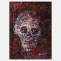 Totenschädel, den Betrachter anblickend, pastose, teilweise gespachtelte und gekratzte Malerei, Öl auf Faserplatte, unten rechts signiert und datiert "M. Feiler [20]13", gerahmt, Falzmaße ca. 40 x 30 cm, Künstlerinfo: dt. Maler, Entwerfer und Illustrator (1925 Plauen/Vogtland bis 2020 ebenda), 1939–43 Schüler der Plauener Kunstschule, gefördert von Kurt Geipel und Walter Löbering, ab 1943 Kriegsdienst im 2. Weltkrieg und schwere Verwundung, nach 1945 zeitweise Tätigkeit als Werbegestalter und Entwerfer für Textilunternehmen, ab 1952 künstlerisch freischaffend, Malaufenthalte in Venedig und auf Mallorca, 2011 Ernennung zum Ehrenbürger von Plauen, tätig in Plauen, Quelle: Vollmer, Frank Weiß "Malerei im Vogtland" und Internet.