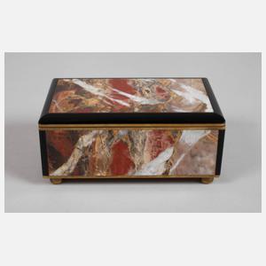 um 1920, langrechteckiger Korpus auf vier flachen Kugelfüßen aus Messing, das Innenleben in rotem Samt ausgekleidet, gute Erhaltung, Maße 5,5 x 12 x 7,5 cm.
