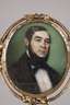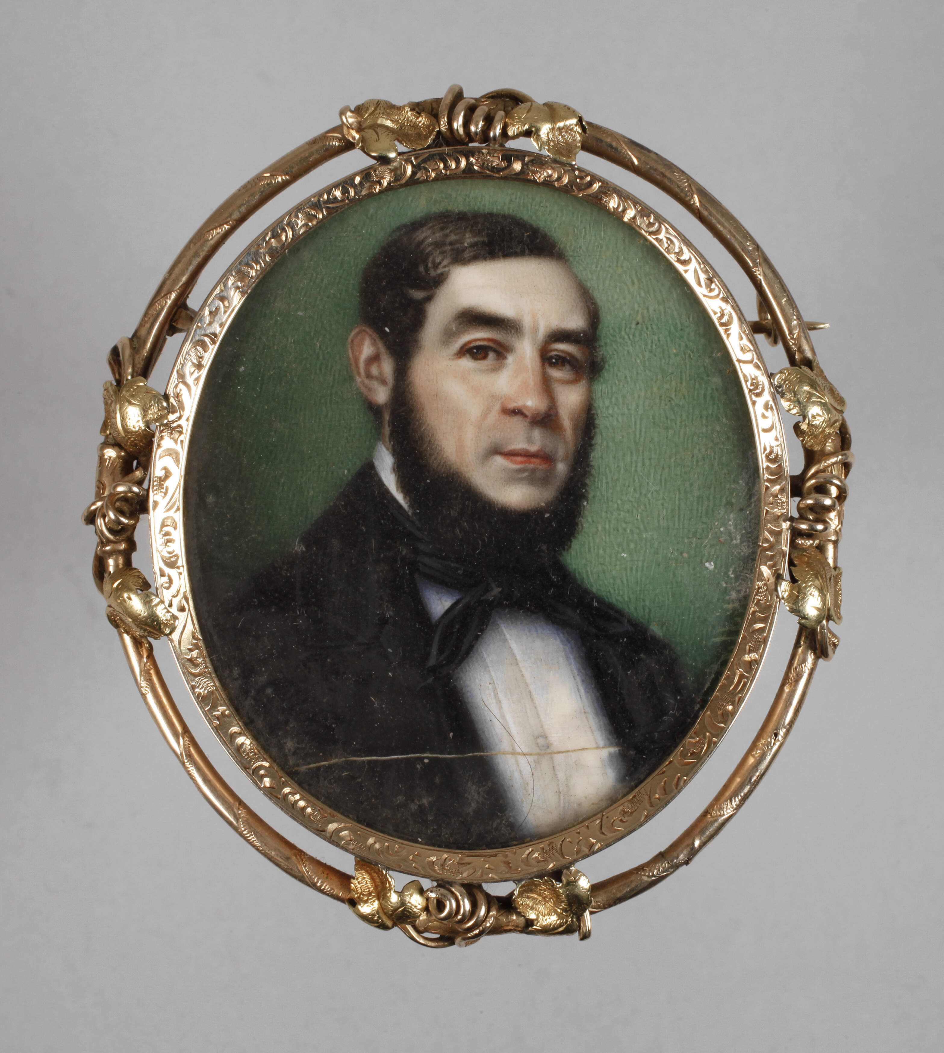 Mitte 19. Jh., unsigniert, Gouache auf Bein, in feinster Lupenmalerei ausgeführtes Bildnis eines Mannes mit Schifferkrause, im dunklen Frack vor monochromem Grund, hinter Glas in vergoldeter Fassung mit rückseitiger Nadel, Platte mit Rissbildung, H 6,5 cm.