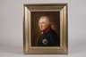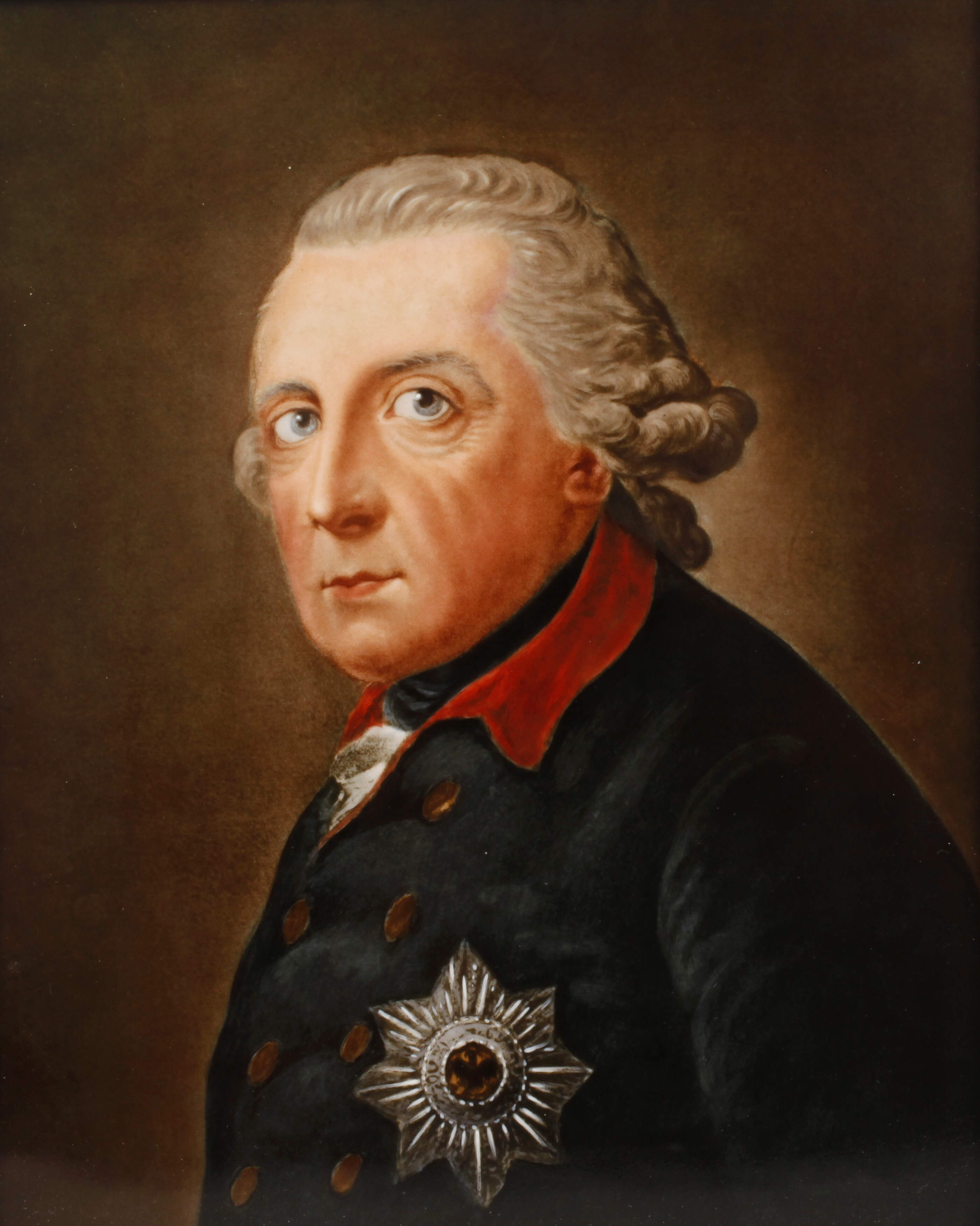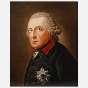 datiert 1941, unsigniert, Firmenetikett, gepinselte Firmenmarke mit Zusatz Germany und Buchstabe G, hochrechteckige Porzellanplatte mit feiner polychromer Bemalung, Brustbildnis des Preußenkönigs Friedrich II. in Uniform vor dunklem Grund nach einem Gemälde von 1781, rückseitig bezeichnet "Friedrich d. Große von Anton Graff 1736-1813" und montierte Dedikation "Unserem Kommandeur, Herrn Hauptmann Leister, in dankbarer Verehrung gewidmet, Das Offz.-Korps J.E.B.437/Darmstadt 6.5.(19)41" mit 20 handschriftlichen Signaturen, dazu angeheftete maschinenschriftliche Abschrift Qualifikationsbericht über den Leutnant Karl Leistner, in breiter Goldleiste, diese minimal bestoßen und farblich kaschiert, sonst guter Zustand, Maße Platte 32 x 26 cm, Maße gesamt 43 x 37,5 cm.