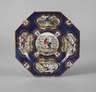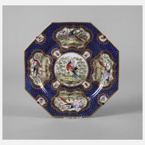 nach englischem Vorbild des 18. Jh., Ausführung Edmé Samson Paris Ende 19. Jh., flach gewölbte, oktogonale Form, reich verziert mit unterglasurblauem Schuppenmosaik, fünf großen und acht kleinen, konzentrisch angeordneten Reserven mit Paradiesvogel- bzw. Insektendarstellung in feiner polychromer Aufglasurbemalung, Rocaillekartuschen in Goldmalerei sowie Goldrand, Wandaufhängung aus Metall abnehmbar, Fahne an einer Ecke restauriert, sonst guter altersgemäßer Zustand, D 23,5 cm.