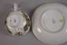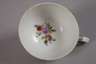 blasse unterglasurblaue Schwertermarken Mitte 18. Jh., 1. Wahl, Ritznummer 4 bzw. 52, reliefierte Form "Dulong", in den vier umlaufenden Rocaillekartuschen und im Spiegel jeweils Landschaftsinsel mit Federvieh bzw. Blumenbukett in feiner polychromer Aufglasurbemalung, Tasse bestoßen und alt restauriert und Reste der alten Goldstaffage, H Tasse 5 cm, D Untertasse 14 cm.