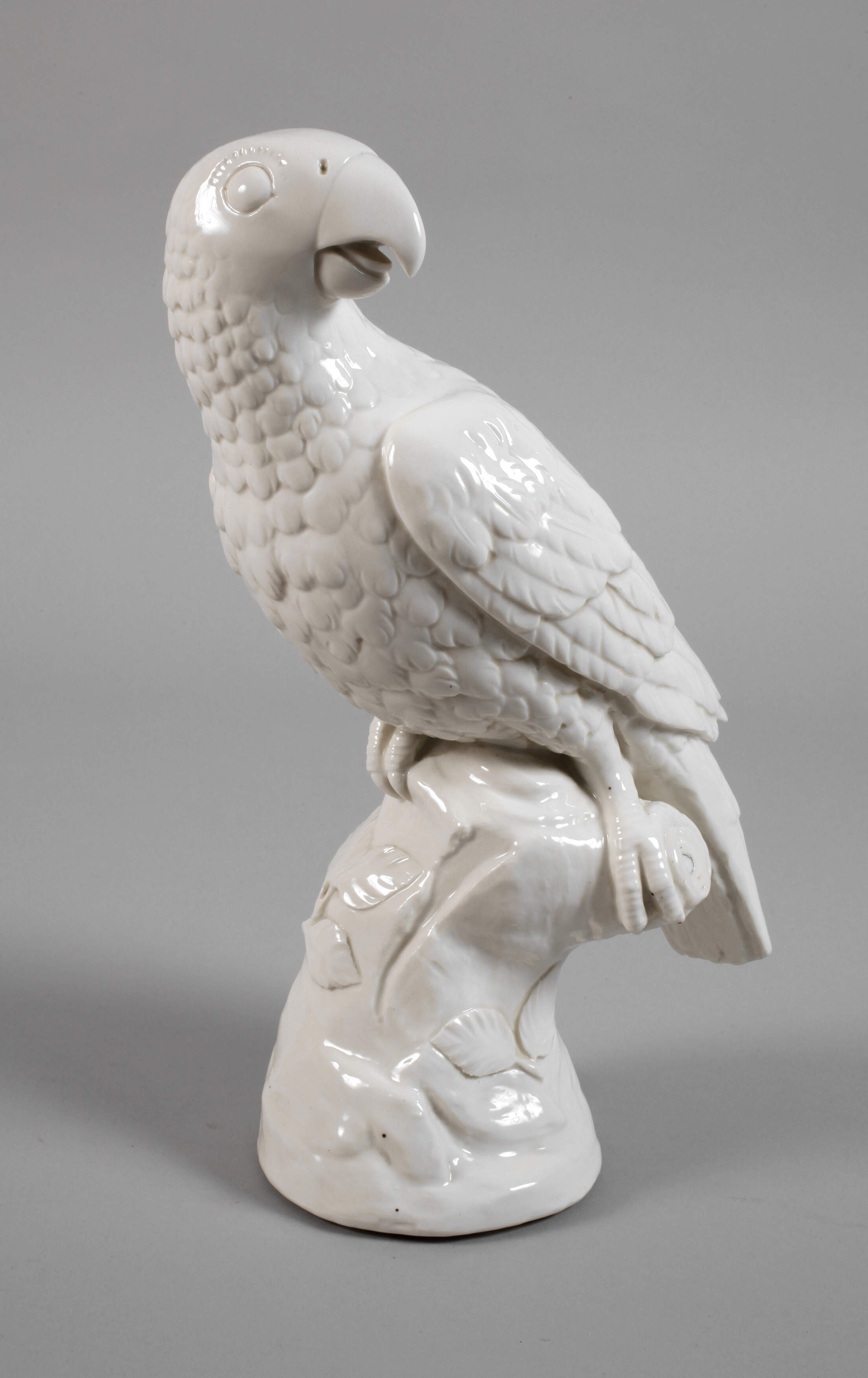 nach Alt Nymphenburger Modell des 18. Jh., Entwurf wohl Dominikus Auliczek um 1770, geprägte Rautenschildmarke ab 1905, geritzte Modellnummer 180, naturalistische Ausformung in Weißporzellan, auf hohem Astsockel sitzender Vogel im Rokokostil, guter Zustand mit minimalen Brandfehlern und Sockelunterseite kaum sichtbar gechipt, H 36 cm. Quelle: Ziffer, Nymphenburger Moderne, S. 77 f, Abb. 76.