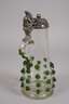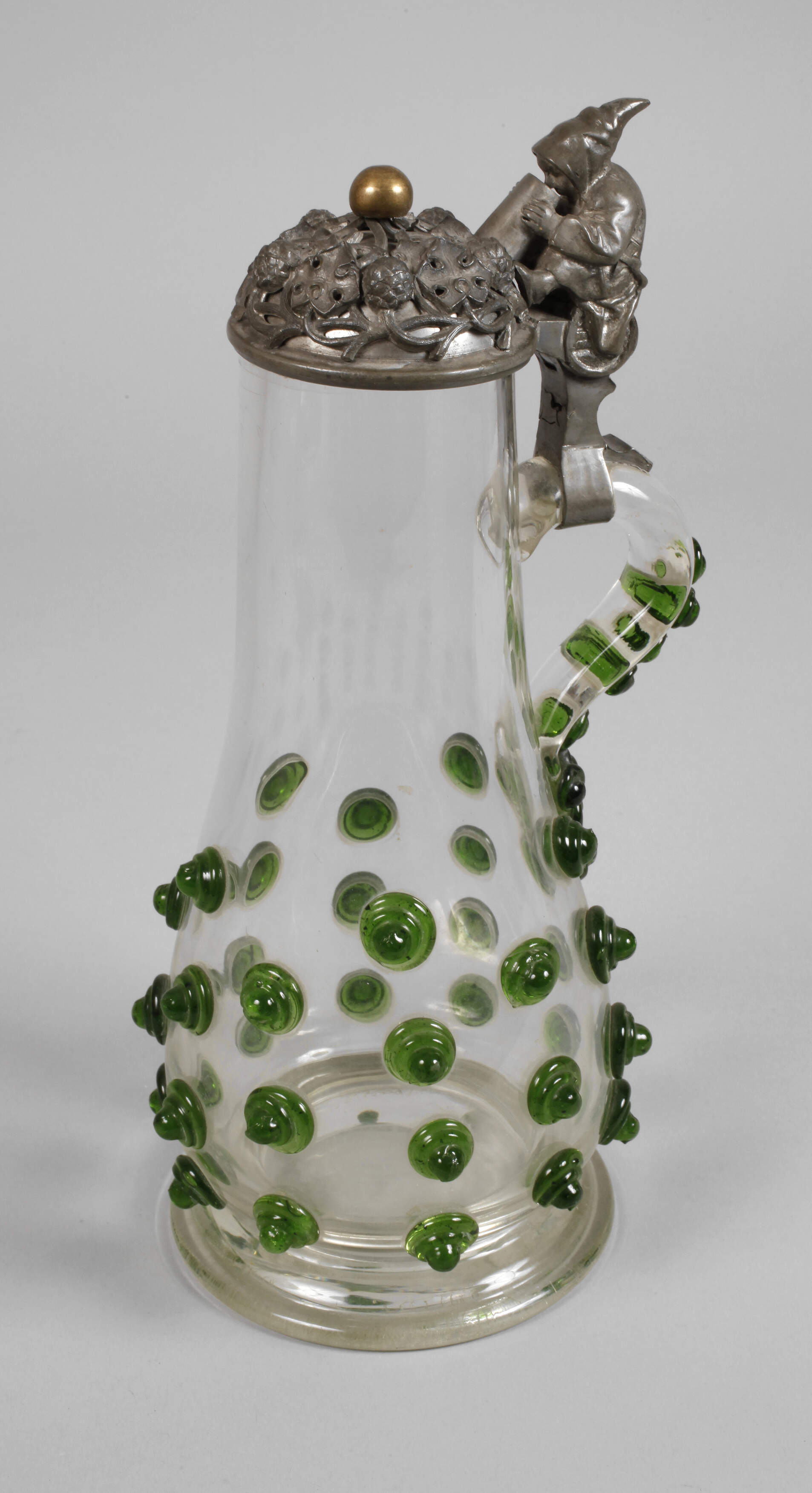 um 1880, Bayerischer Wald, farbloses Glas formgeblasen, aufgeschmolzene mehrteilige Nuppen aus grünem Glas, Zinndeckel gemarkt Kreitman (Zinngießer München), Drücker als trinkender Zwerg, Messingkugel als Knauf, Innenkante bestoßen, sonst normale Gebrauchsspuren, H ca. 33 cm.