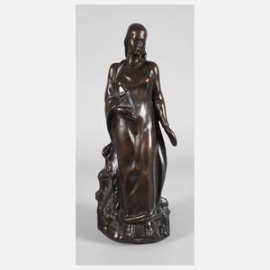 20. Jh., verso mit reliefiertem Gießersignet BW im Kreis, Bronze dunkelbraun patiniert, halbfigurige Darstellung der Heiligen Barbara als Schutzpatronin der Bergleute und Tunnelbauer mit einem Turm im Arm, dahinter angedeutete Industrielandschaft, zu ihren Füßen gekreuzte Kanonenrohre mit Flamme, altersgemäß gut erhalten, H ca. 50 cm. Quelle: Museum Digital, westfalen.museum-digital.de/object/17455, Eigentum des Deutschen Bergbaumuseum Bochum.