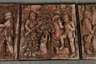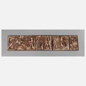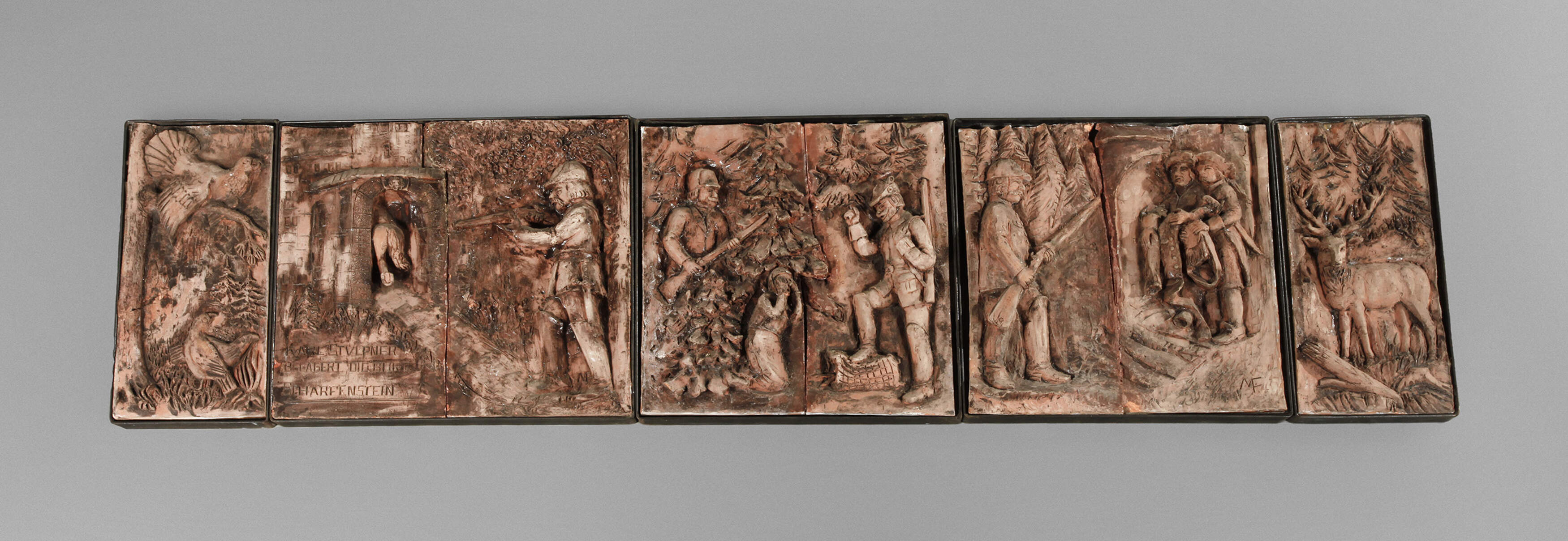 Mitte 20. Jh., monogrammiert NF, geritzter Schriftzug: "Karl Stülpner belagert die Burg Scharfenstein", Terrakotta, partiell farbig glasiert und mehrteilig in dunkel gefasste Metallrahmen montiert, Reliefs mit jagdlichen Motiven und den in der Erzgebirgsregion bekannten Taten des Wildschützen Karl Stülpner, unter anderem die Belagerung der Burg Scharfenstein, Brandrisse und kleinere Fehlstellen, H je ca. 51 cm, B 57,5 cm und je zwei Mal 50 cm und 25 cm.