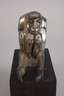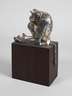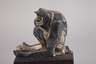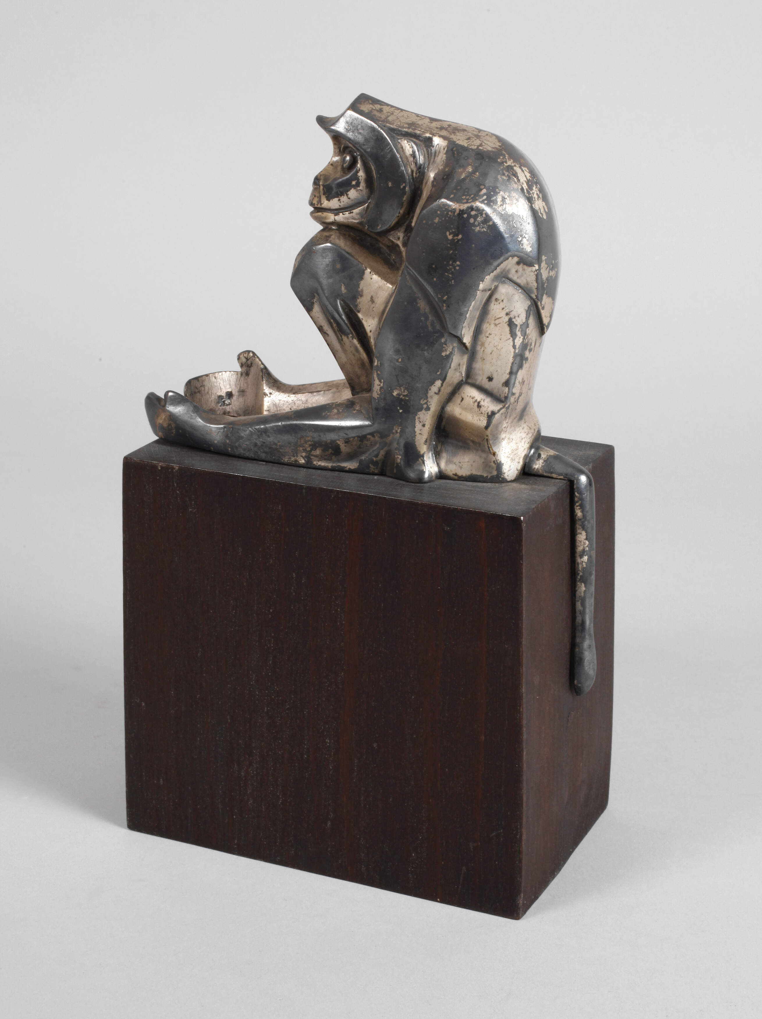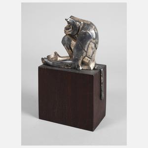 Frankreich, um 1930, unsigniert, Bronze versilbert und zaponiert, stilisierter sitzender Affe mit kubistischen Zügen, die Hände wartend ausgestreckt, wohl ehemals etwas haltend, abnehmbar auf Holzsockel, Patina mit Alters- und Oxidationsspuren, H Affe ca. 20 cm, H gesamt ca. 25 cm.